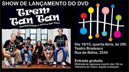 Criado a partir da experiência do projeto de saúde mental da Prefeitura de Belo Horizonte, o grupo Trem Tan Tan apresenta ao público o resultado do show de gravação de seu primeiro DVD: “Sambabilolado e outros tan tans”, realizado em maio do ano passado no Teatro Francisco Nunes. O lançamento oficial será no dia 19 de outubro, quarta-feira, às 20h, no Teatro Bradesco (Rua da Bahia, 2244, Lourdes, Belo Horizonte, MG) com entrada franca e participações especiais de Aline Calixto e Mandruvá.