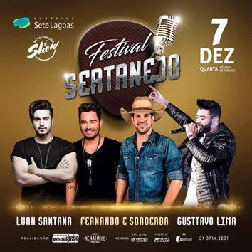 O projeto “Sete Lagoas é Show”, que colocou a cidade no circuito dos grandes artistas, recebe o Festival Sertanejo. O evento será realizado no dia 07 de dezembro, quarta-feira, véspera de feriado, partir das 21h, com as apresentações de Gusttavo Lima, Fernando & Sorocaba e Luan Santana no estacionamento do Shopping Sete Lagoas (Av. Otávio Campêlo Ribeiro, 2801, Sete Lagoas/MG).